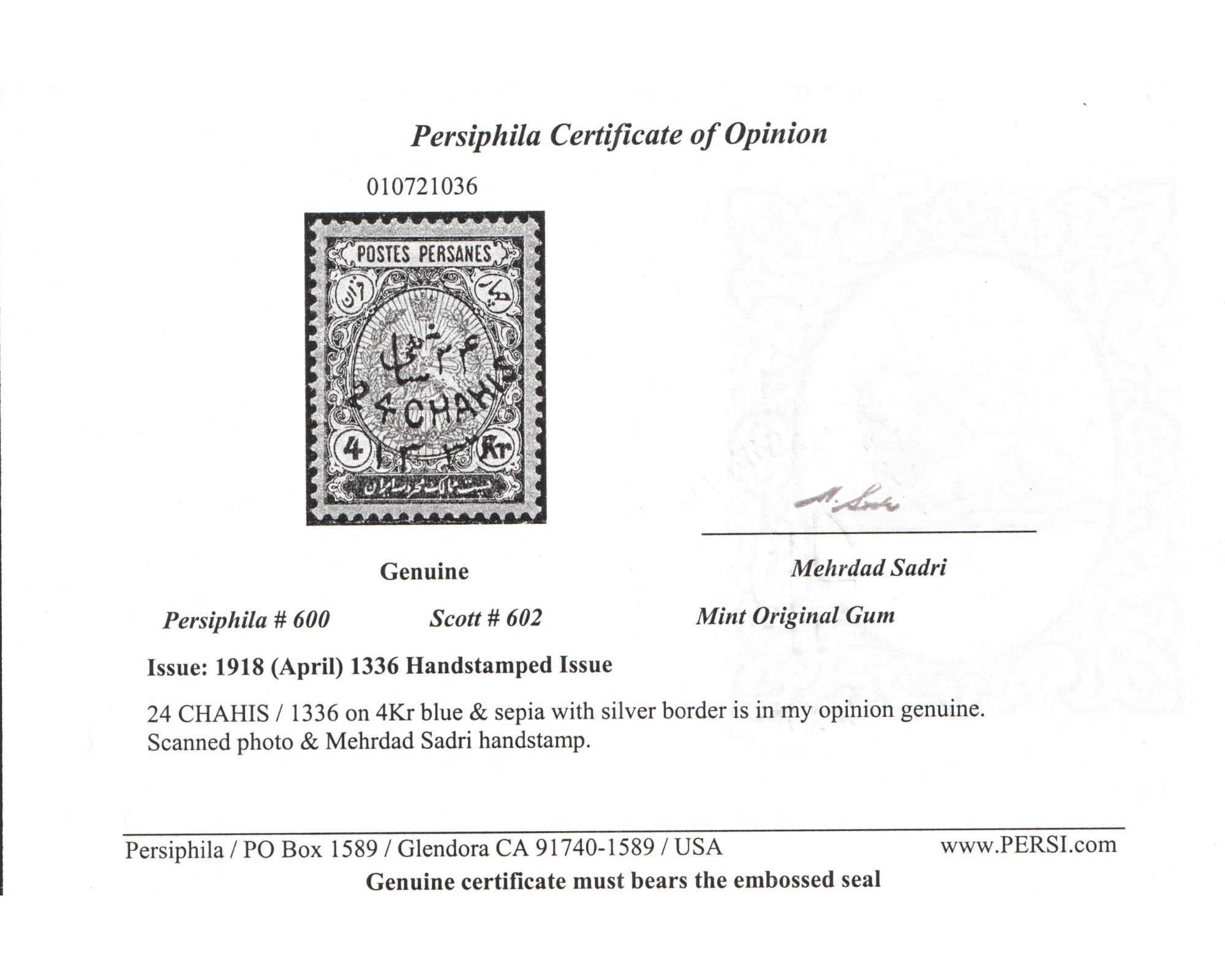Certificate by IPSCCondition; Mint very light trace of Hinge با اثر بسیار ضعیف شارنیهبرای دیدن با بهترین کیفیت ماوس کامپیوتر را روی تصویر تکان دهید