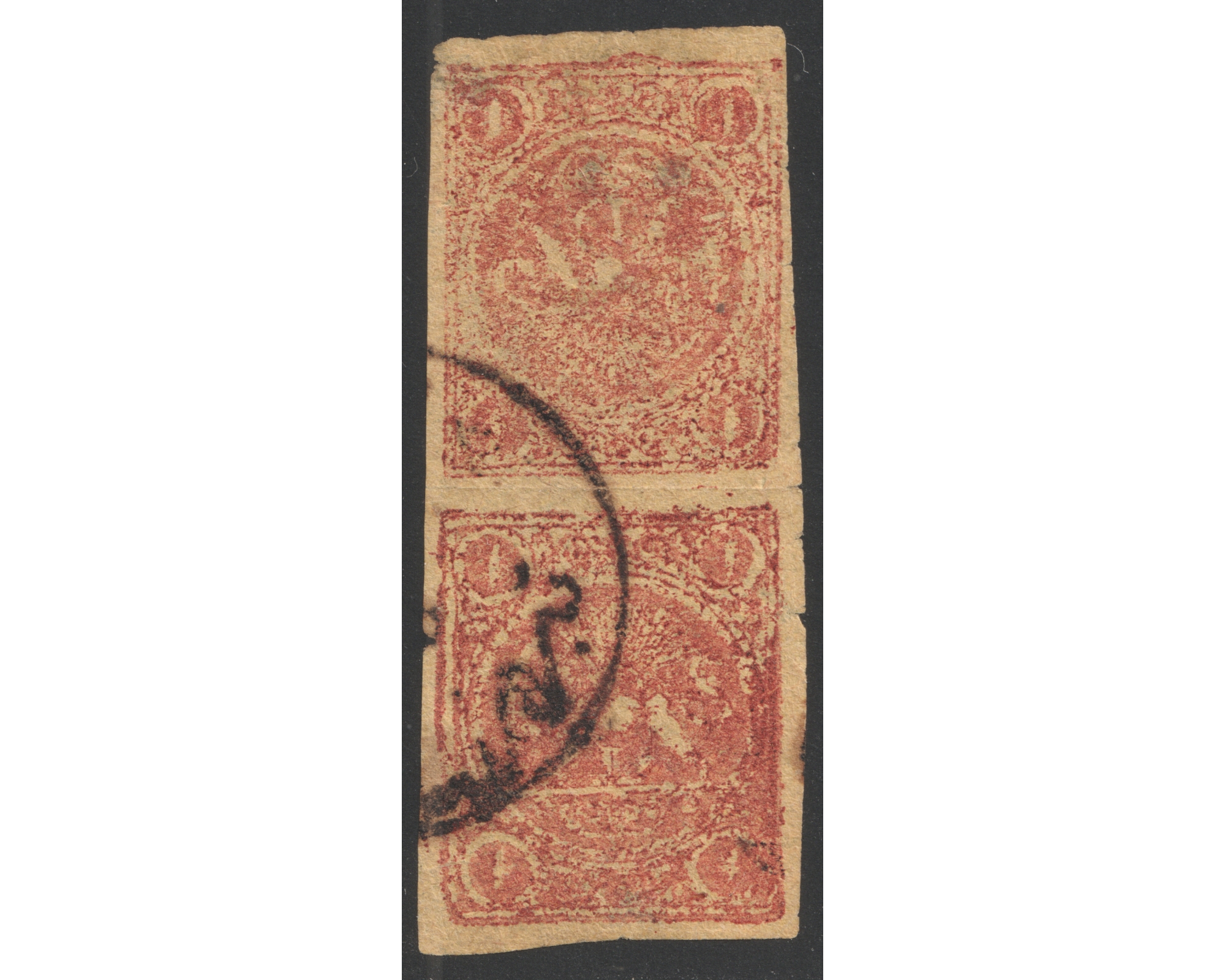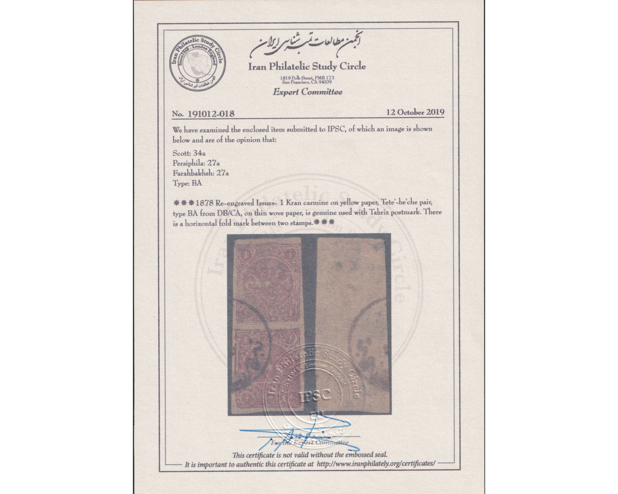 1 Kran Carmine on yellow paperte'te - be'che pair, Certificate by IPSC
