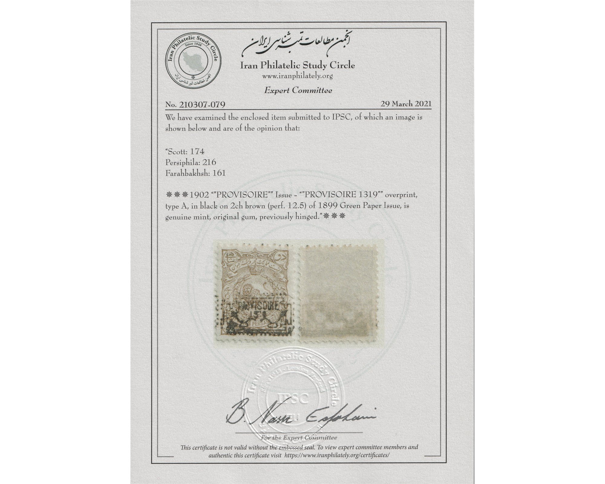 1902 Provisoire Issue 2 Chahi Type A"Early Impression"دوشاهی سري کاغذ سبز با مهر دستی موقتی تایپ ۱ با سرتیفیکیت IPSC Certificate کیفیت: با اثربسیار ضعیف شارنیه