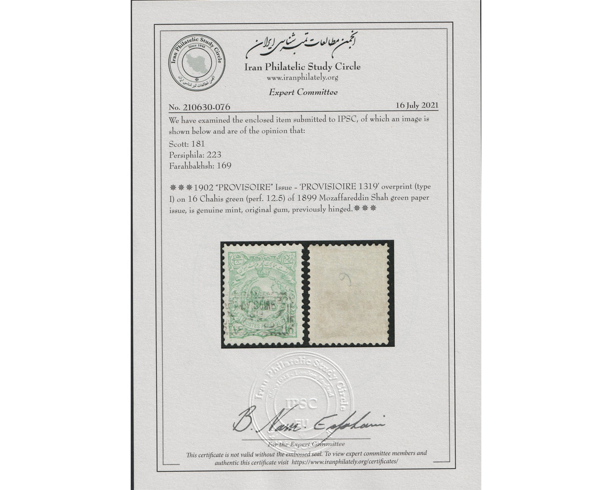 1902 Provisoire Issue 16 Chahi Type A"Early Impression"شانزده شاهی سري کاغذ سبز با مهر دستی موقتی تایپ ۱ با سرتیفیکیت IPSC Certificate کیفیت: با اثربسیار ضعیف شارنیه