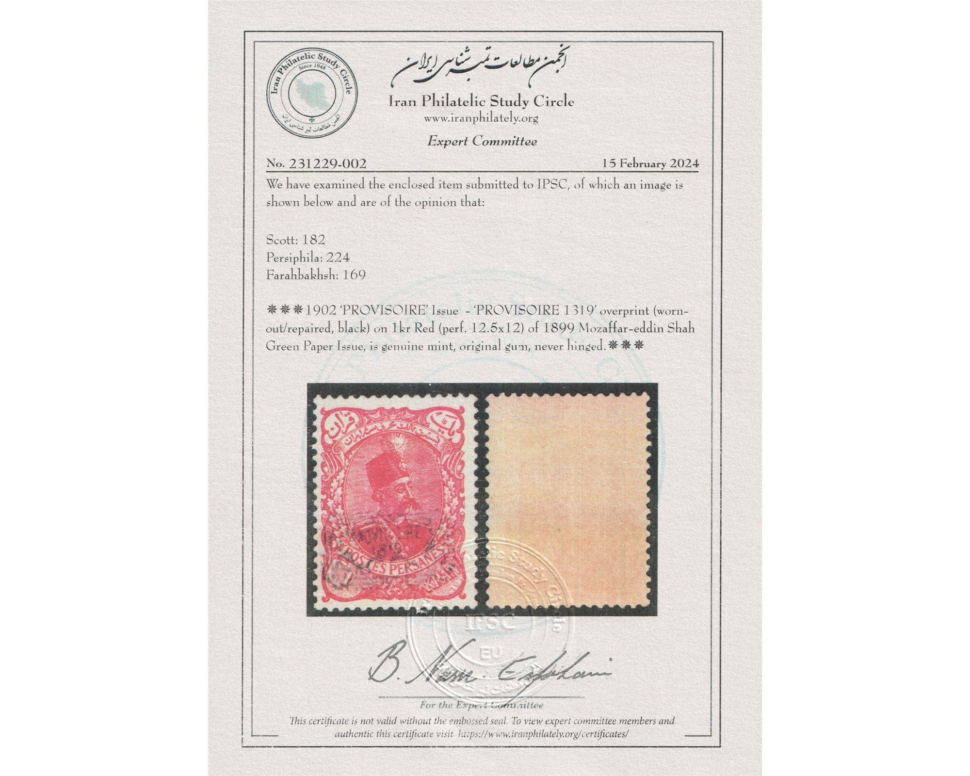 1902 Provisoire Issue 1 Kran Type A "Early Impression" یک قران سري کاغذ سبز با مهر دستی موقتی تایپ ۱ با سرتیفیکیت IPSC Certificate کیفیت: با چسب اورجینال و بدون اثرشارنیه