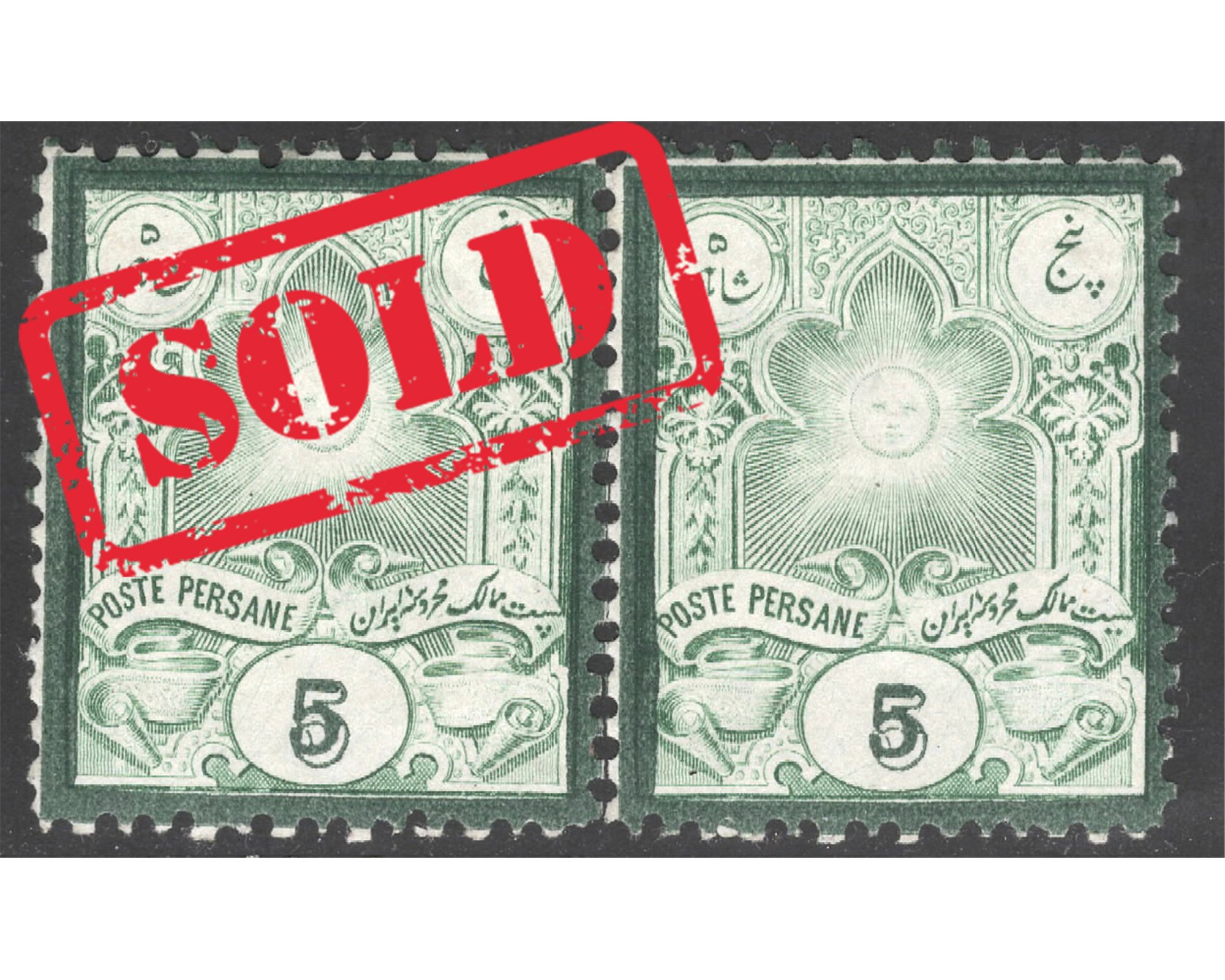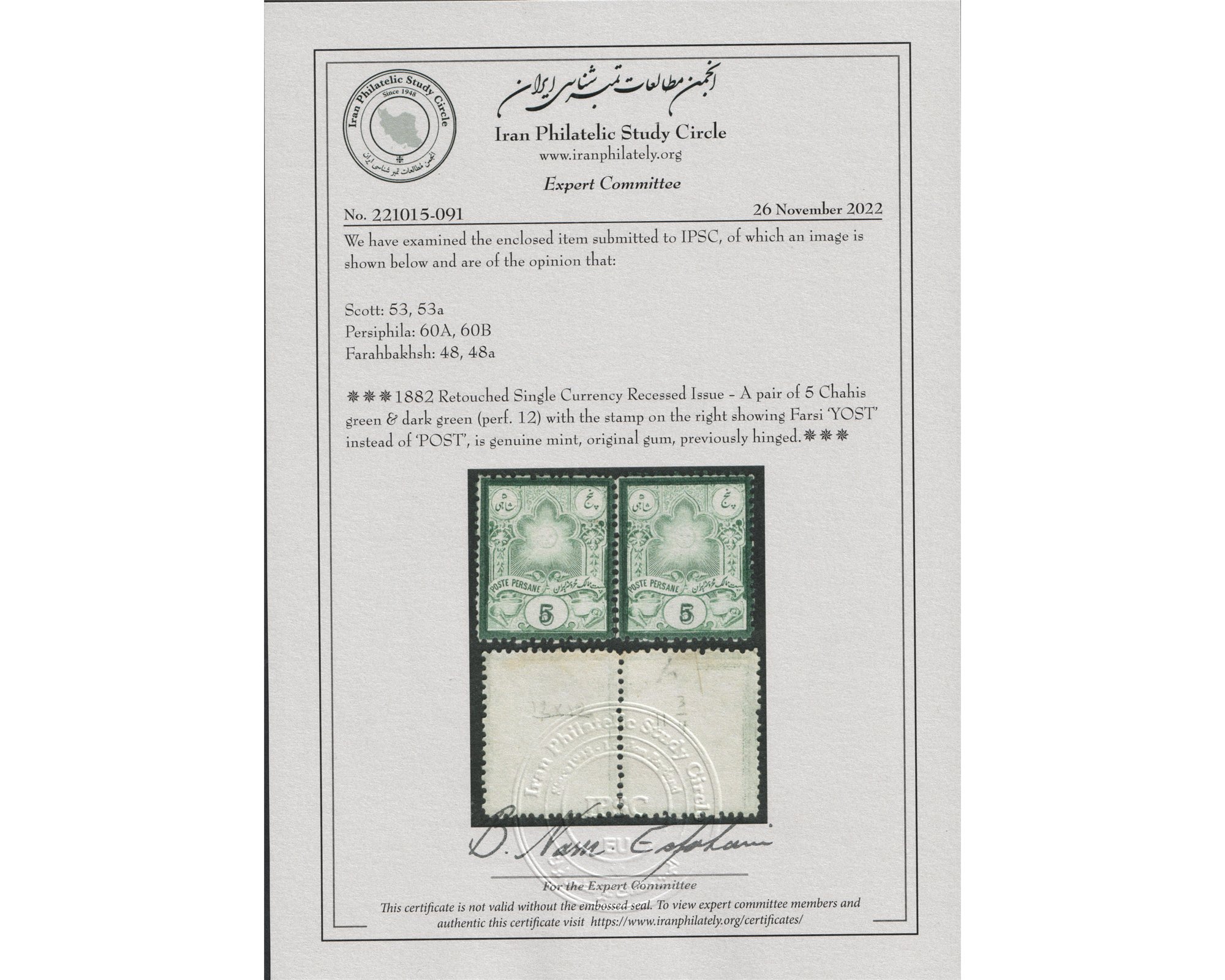جفت پنج شاهی ناصرالدین شاه سری گراوه با واریته یست Condition; Mint Hinged IPSC Certificate A hinge has been added to rinforce Perforations با چسب اورجینال و با شارژ نیه
