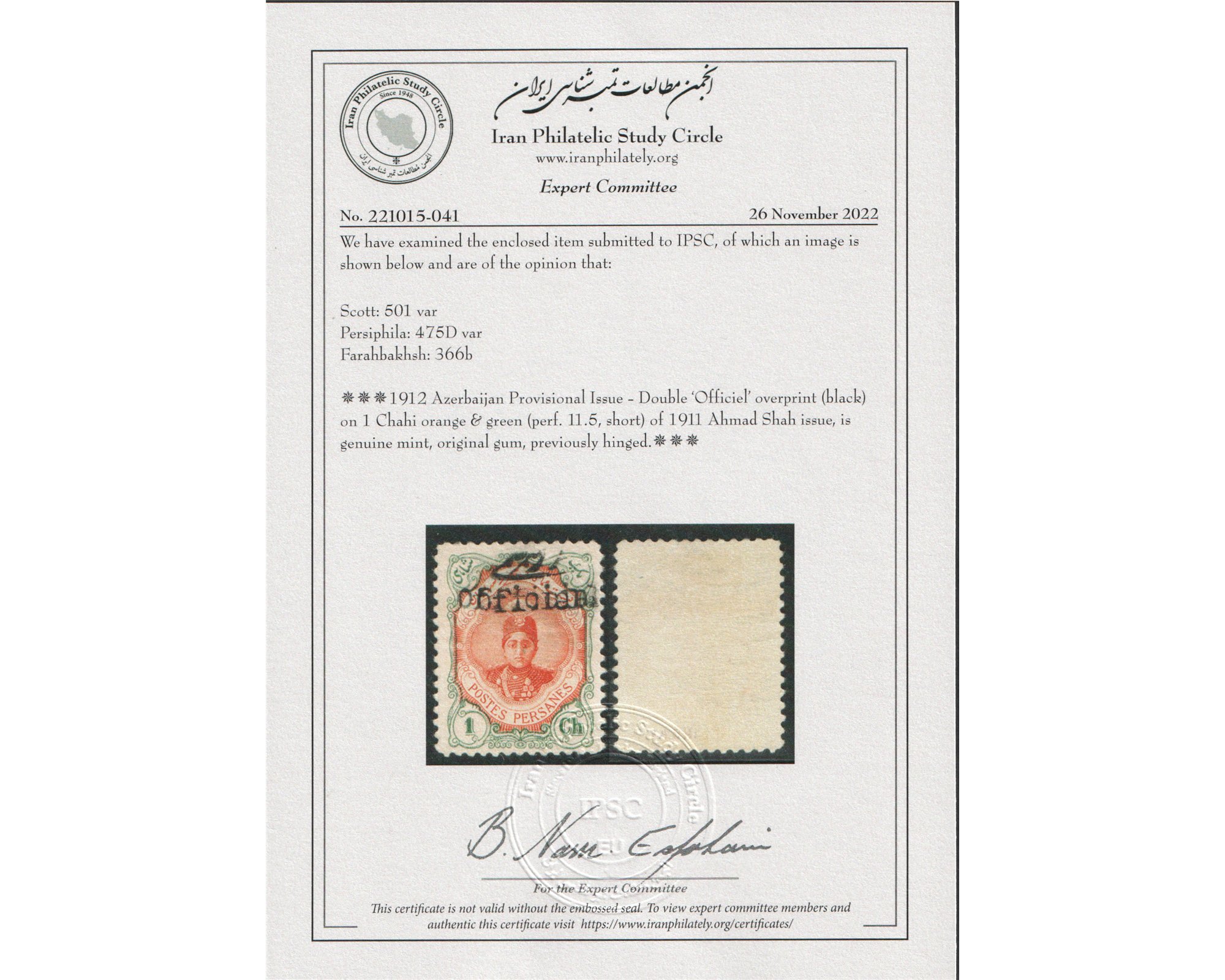 IPSC یک شاهی سری رسمی با رو چاپ دوبله با سرتیفیکیت Condition; Mint Very Light Trace of Hinge با اثر بسیار ضعیف شار نیه برای دیدن با بهترین کیفیت ماوس کامپیوتر را روی تصویر تکان دهید