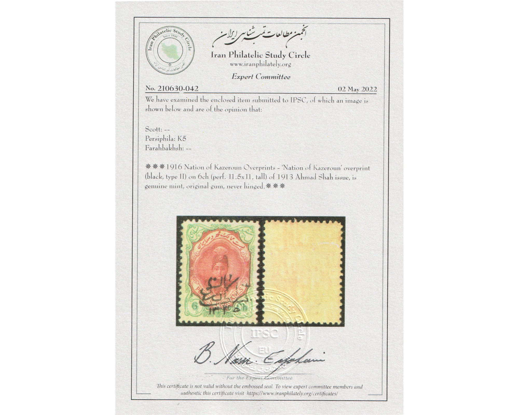 شش شاهی با رو چاپ ملت کازرون با سرتیفیکیتCondition; Mint Never Hingedبدون اثر شار نیهبرای دیدن با بهترین کیفیت ماوس کامپیوتر را روی تصویر تکان دهید