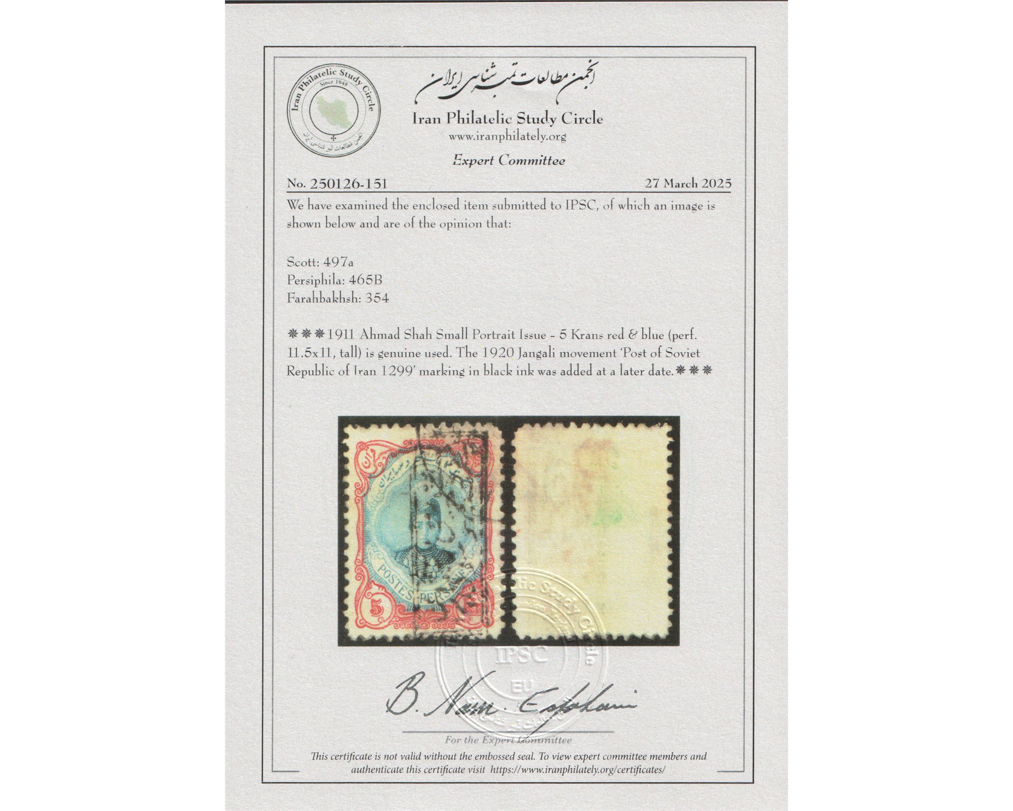 مهر نهضت جنگلی روی تمبر پنج قران احمدی کوچک با سرتیفیکیت