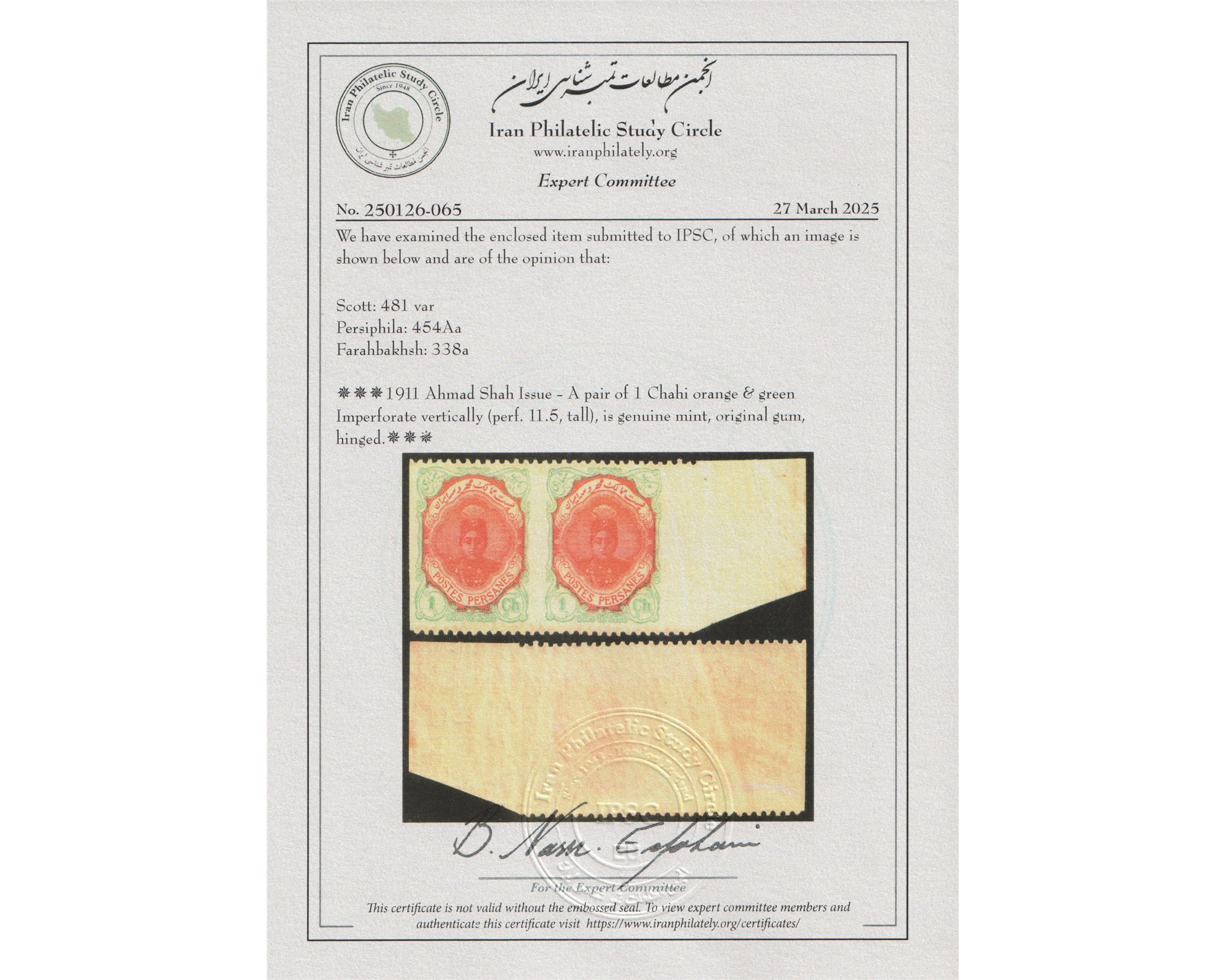 یک شاهی احمدشاه ۱۹۱۱ جفتی بیدندانهCertificate by IPSCCondition; Mint Very Lightly Hinged با اثر بسیار ضعیف شار نیهبرای دیدن با بهترین کیفیت ماوس کامپیوتر را روی تصویر تکان دهید