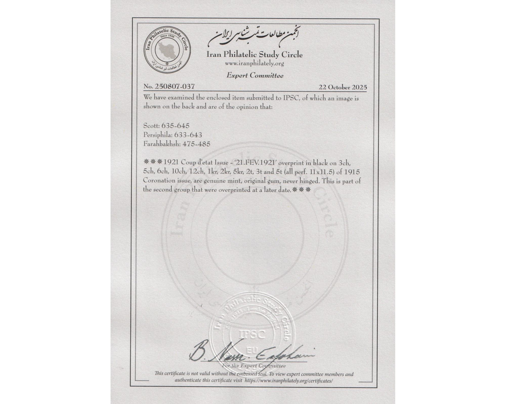 مهر دستی جمادیالاخری نوع یک با سرتیفیکیتCertificate By IPSCCondition: Mint Never Hingedکیفیت عالی بدون اثر شارنیهبرای دیدن با بهترین کیفیت ماوس کامپیوتر را روی تصویر تکان دهید