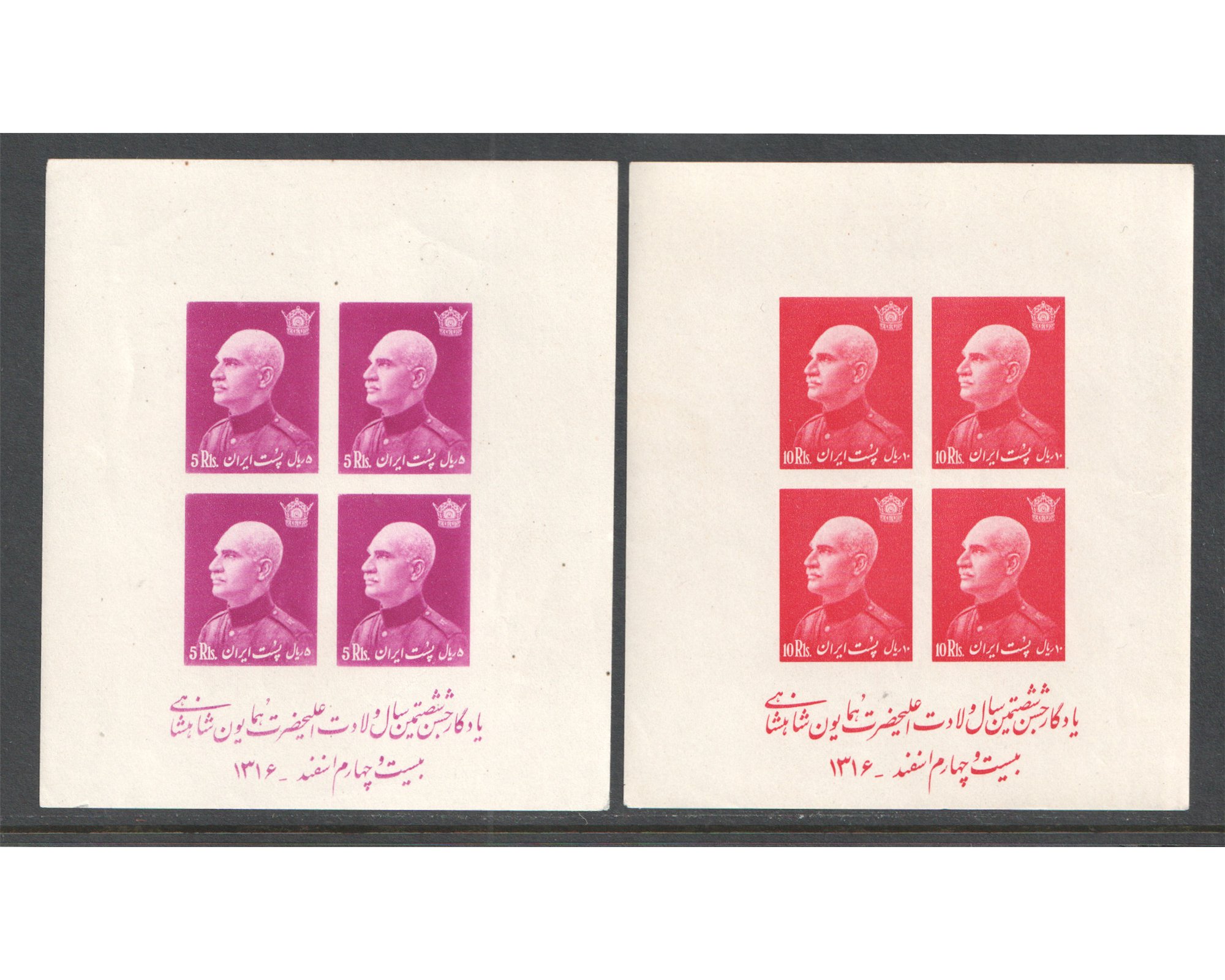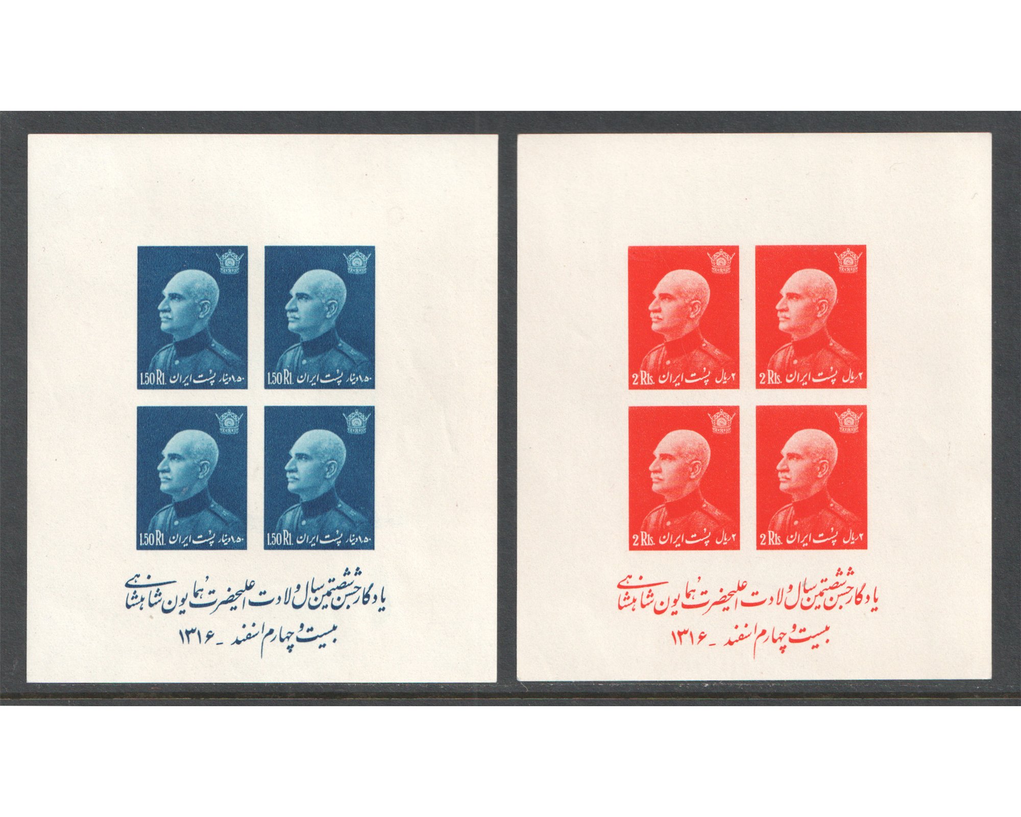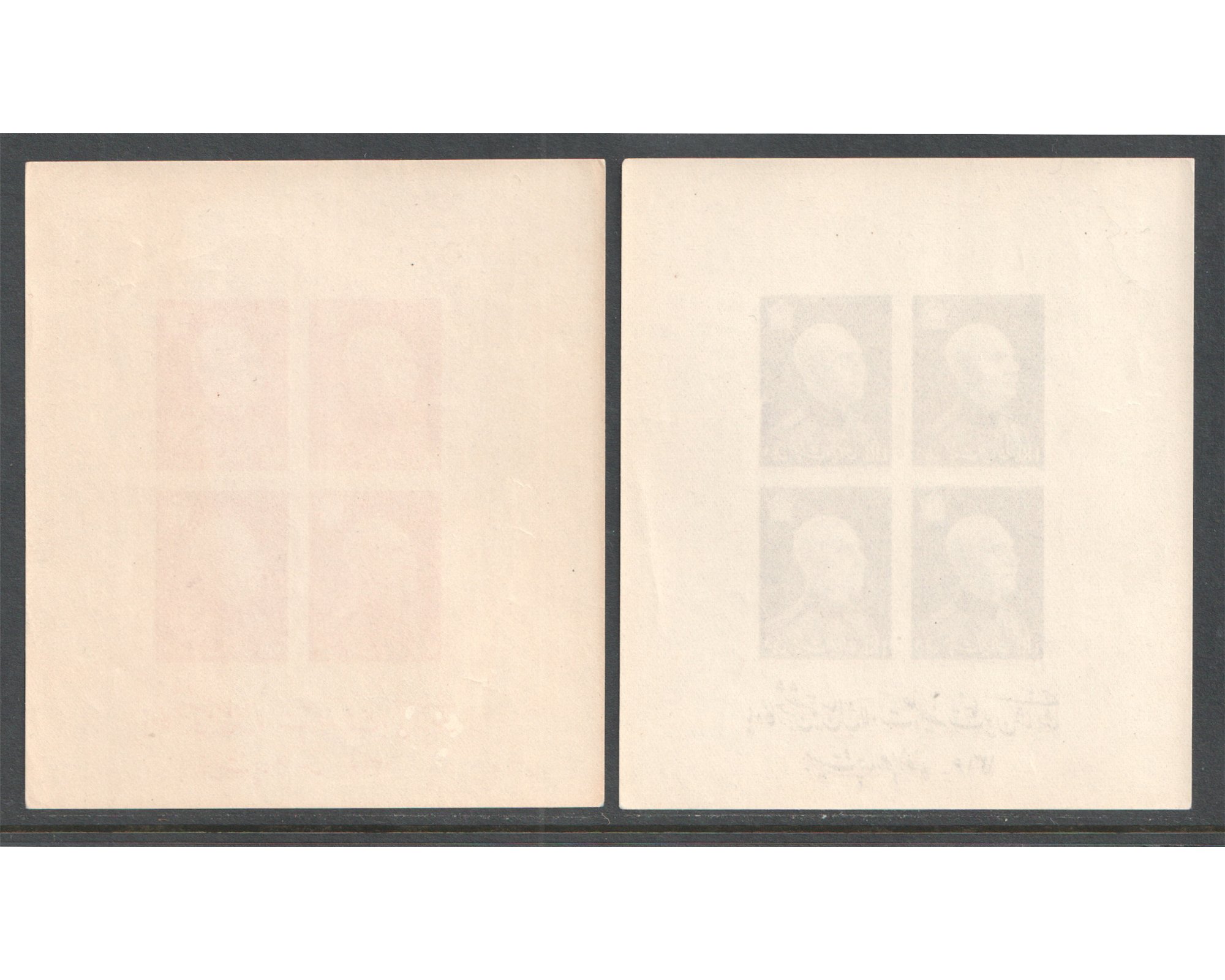 سال ۱۳۱۶ـ بلوک شصتمین سال تولد رضا شاه پهلوی1939 Reza Shah Birthday Issue Imperforated Blocks Condition: Mint Never Hingedبدون اثر شارنیهبرای دیدن با بهترین کیفیت ماوس کامپیوتر را روی تصویر تکان دهید