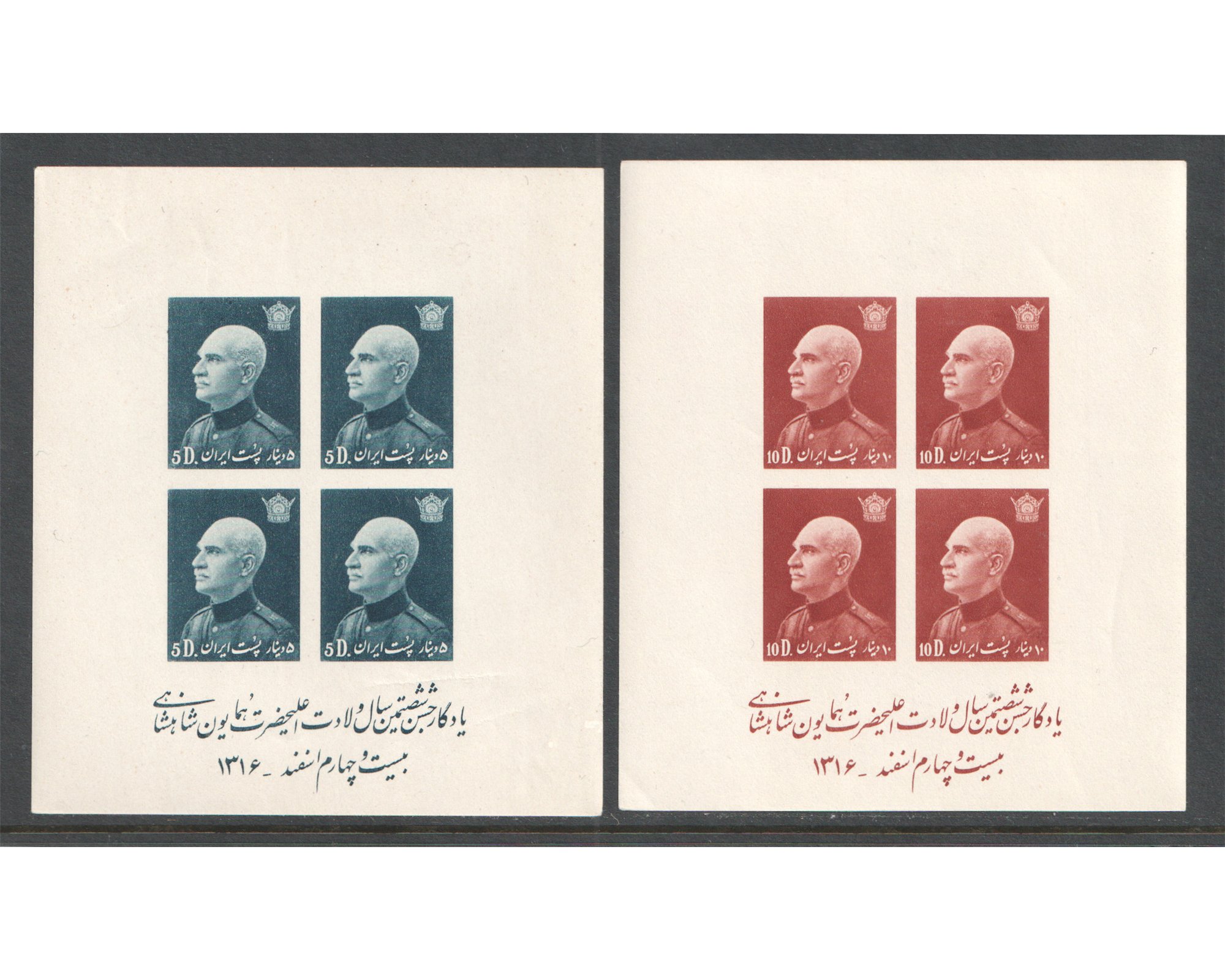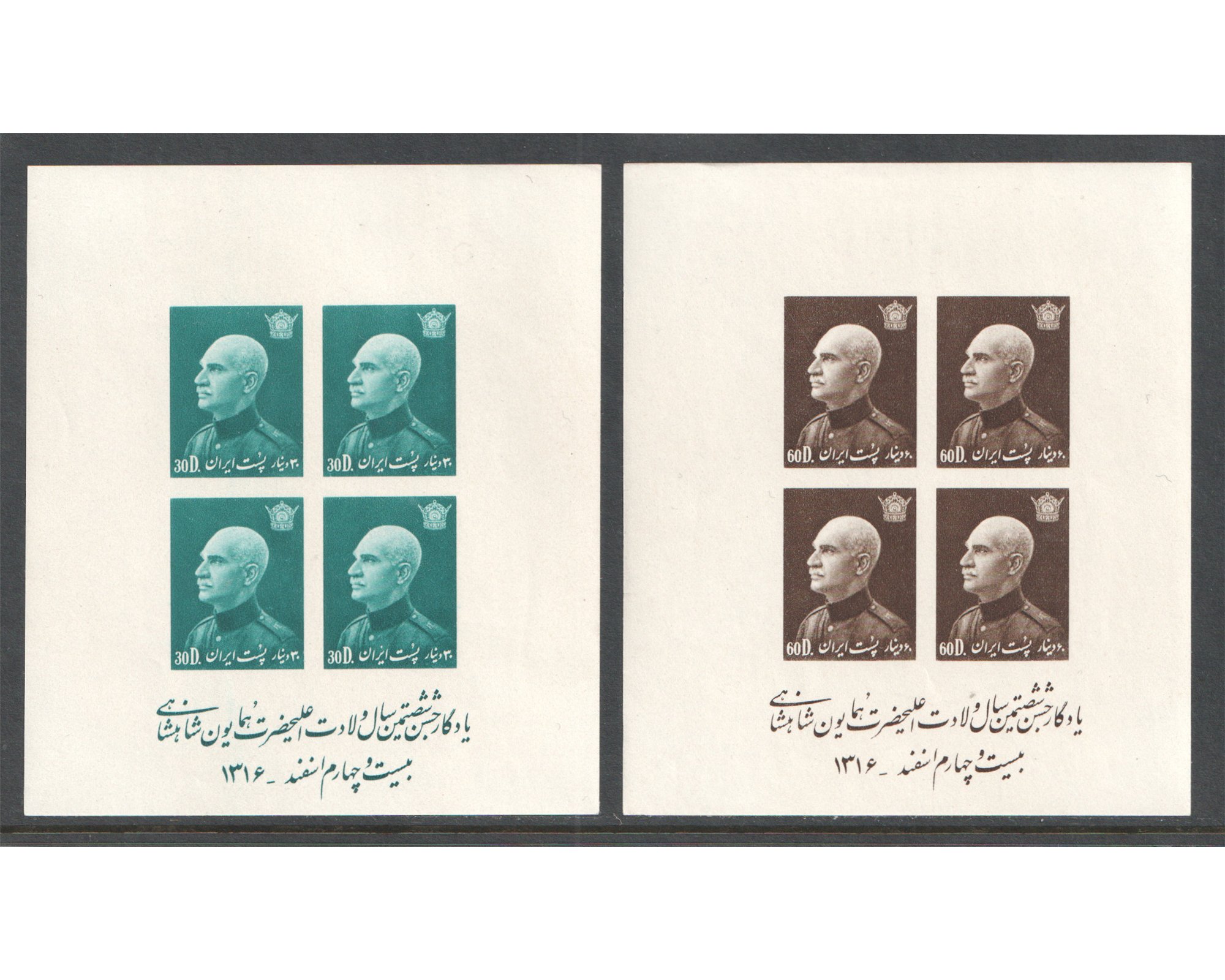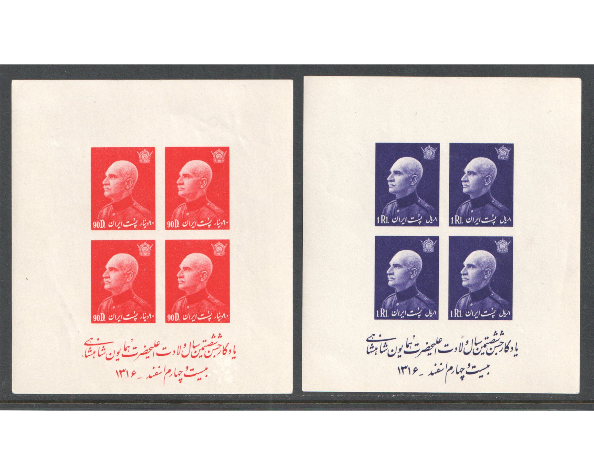 سال ۱۳۱۶ـ بلوک شصتمین سال تولد رضا شاه پهلوی1939 Reza Shah Birthday Issue Imperforated Blocks Condition: Mint Never Hingedبدون اثر شارنیهبرای دیدن با بهترین کیفیت ماوس کامپیوتر را روی تصویر تکان دهید