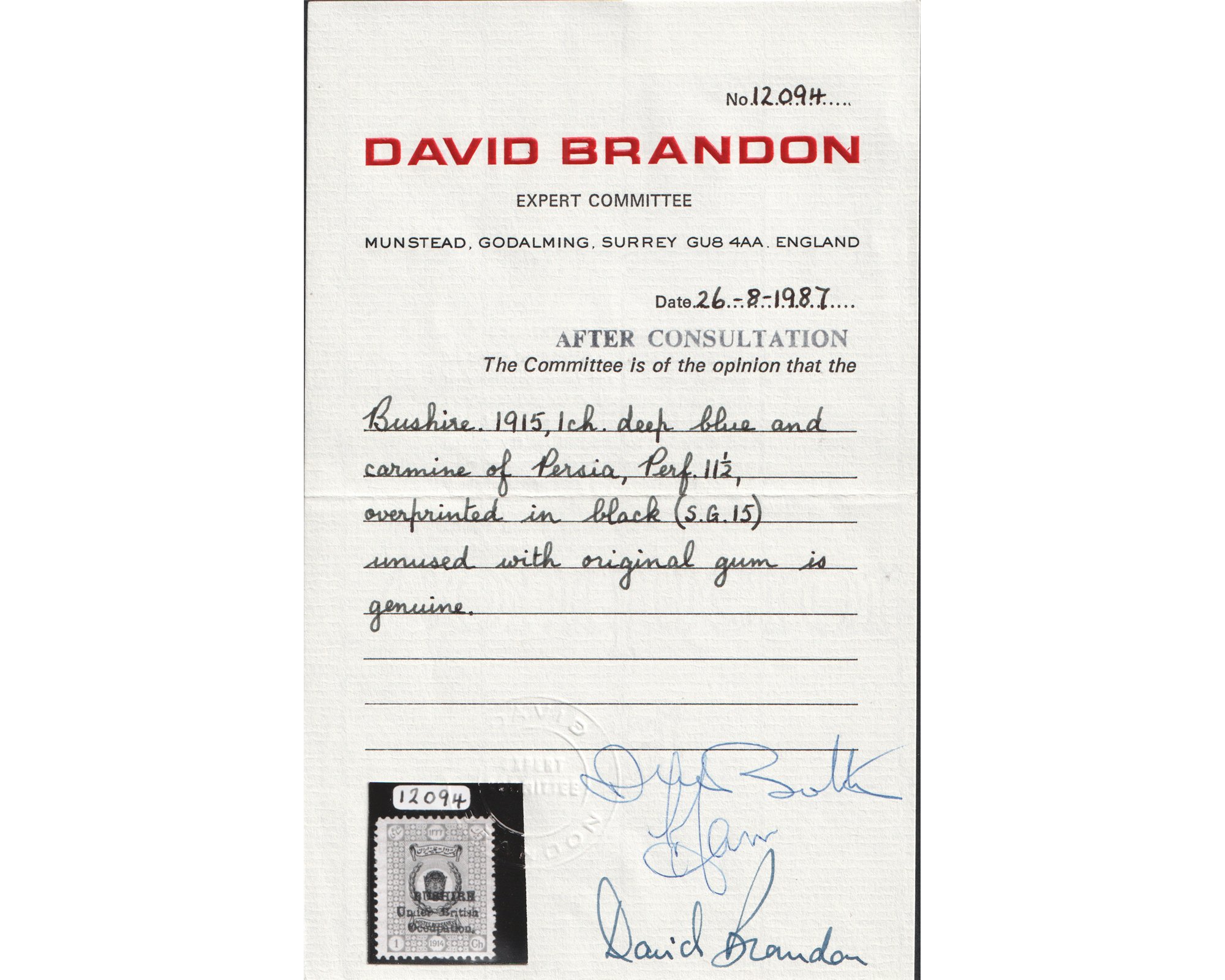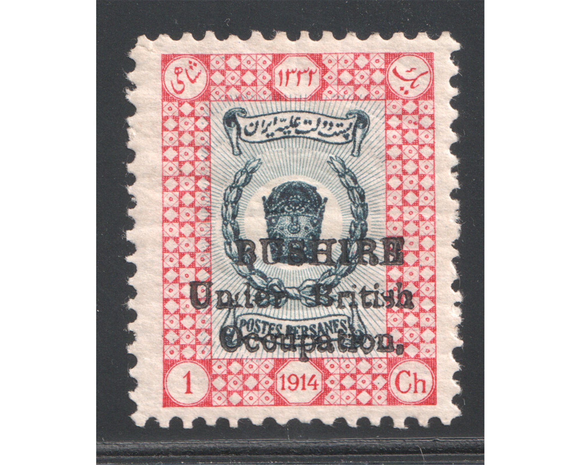 یک شاهی سری تاجگذاری با رو چاپ بوشهر Certificated by David Brandon Condition; Mint Light Trace of Hingeبا چسب اورجینال و اثر ضعیف شار نیهبرای دیدن با بهترین کیفیت ماوس کامپیوتر را روی تصویر تکان دهید