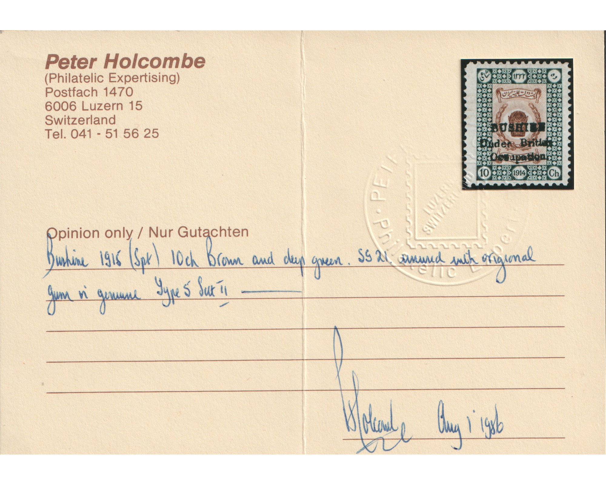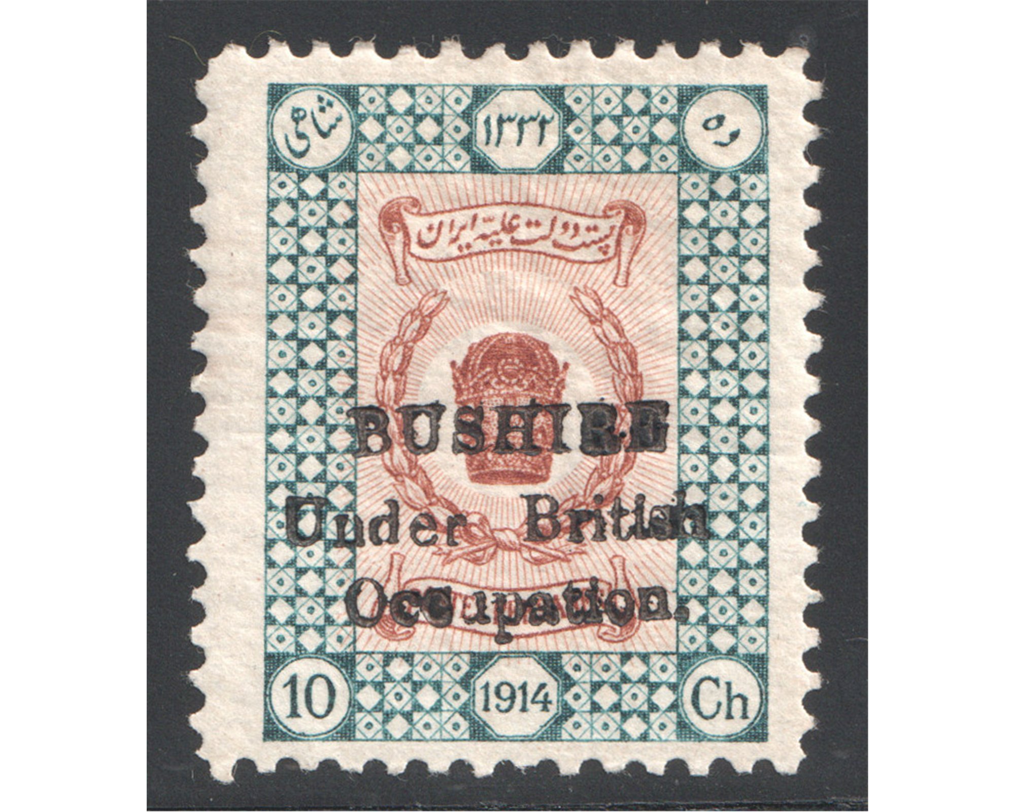ده شاهی سری تاجگذاری با رو چاپ بوشهر با سرتیفیکیتCertificated by Peter Holocombe Condition; Mint Light Trace of Hingeبا چسب اورجینال و اثر شار نیهبرای دیدن با بهترین کیفیت ماوس کامپیوتر را روی تصویر تکان دهید
