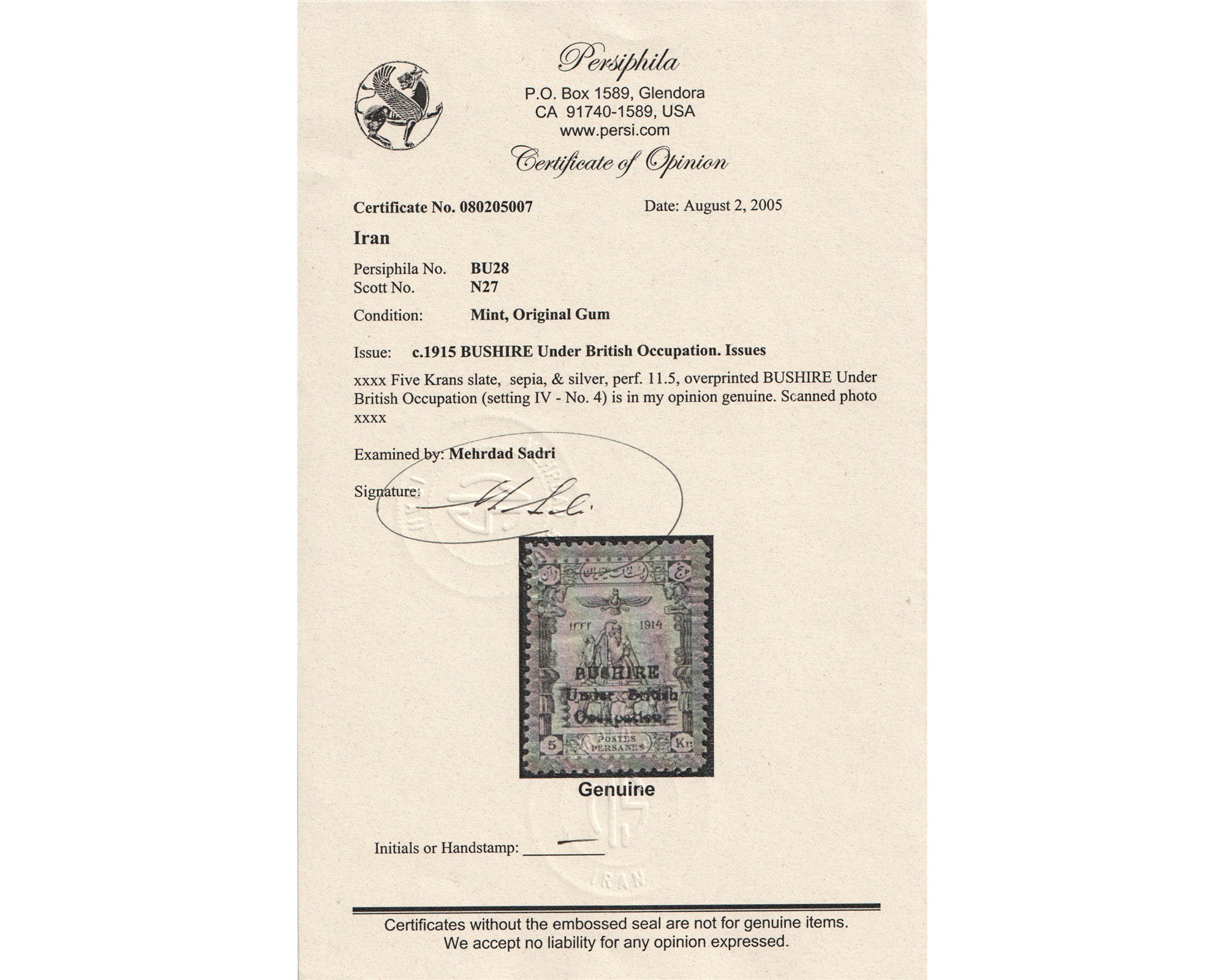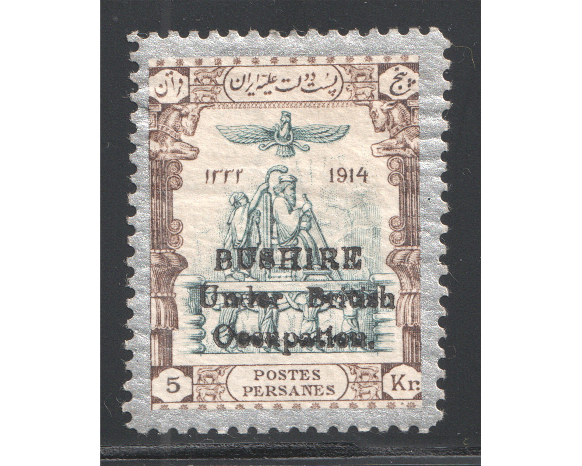پنج قران سری تاجگذاری با رو چاپ بوشهر با سرتیفیکیتCertificated by Mr. SadriCondition; Mint Lightly Hingedبا چسب اورجینال و اثر ضعیف شار نیهبرای دیدن با بهترین کیفیت ماوس کامپیوتر را روی تصویر تکان دهید