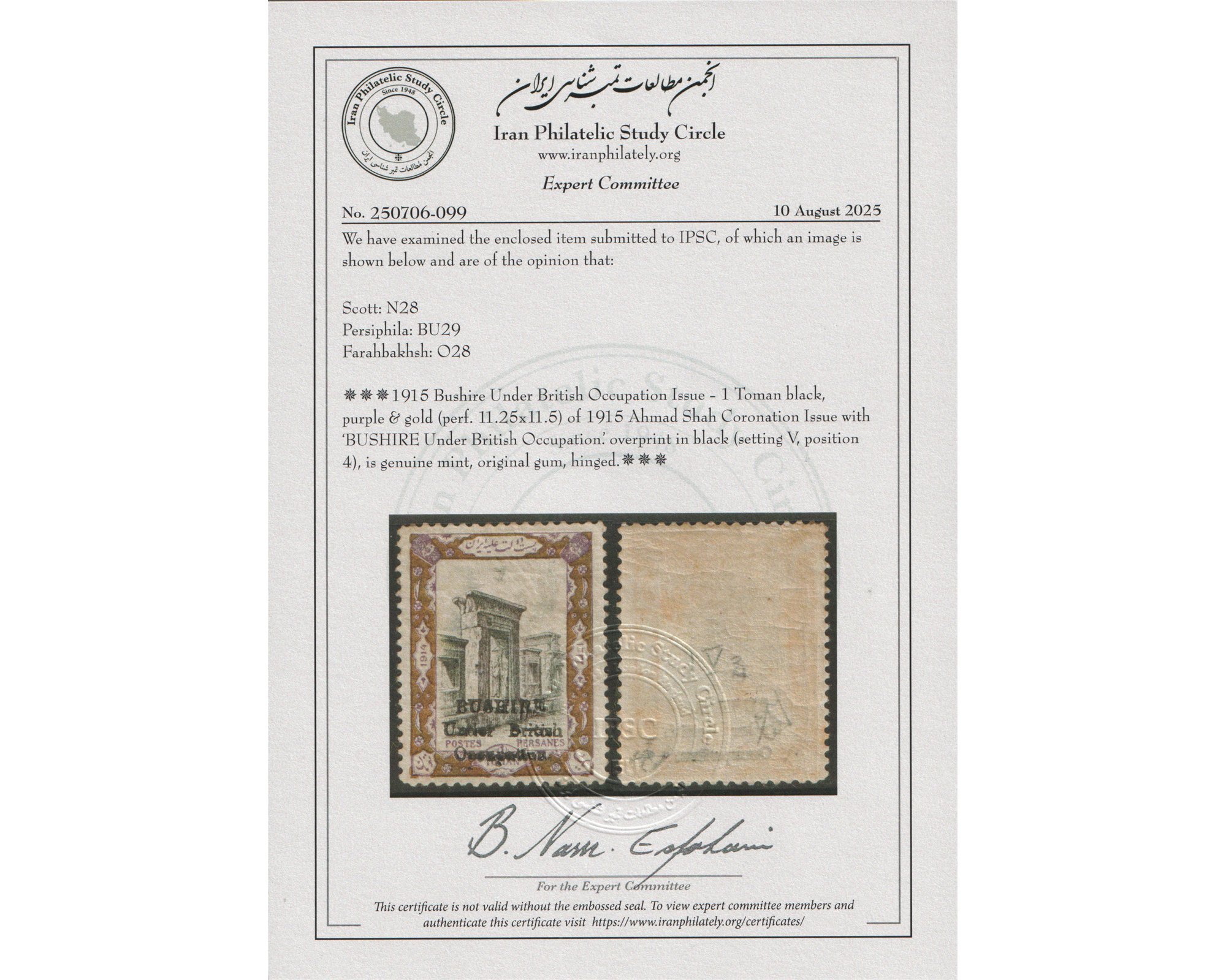یک تومان سری تاجگذاری با رو چاپ بوشهر با سرتیفیکیتCertificated by IPSCCondition; Mint Lightly Hingedبا چسب اورجینال و اثر ضعیف شار نیهبرای دیدن با بهترین کیفیت ماوس کامپیوتر را روی تصویر تکان دهید