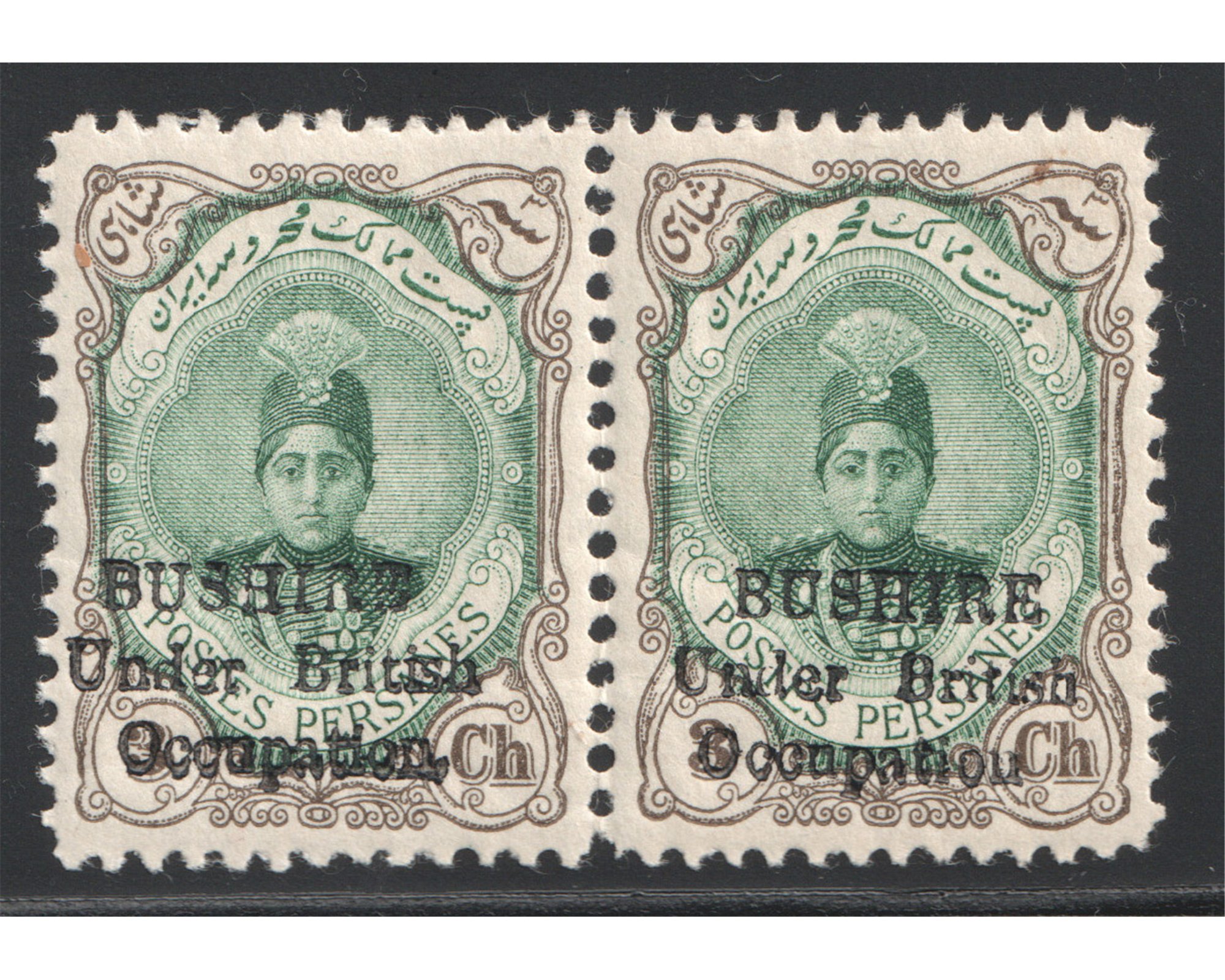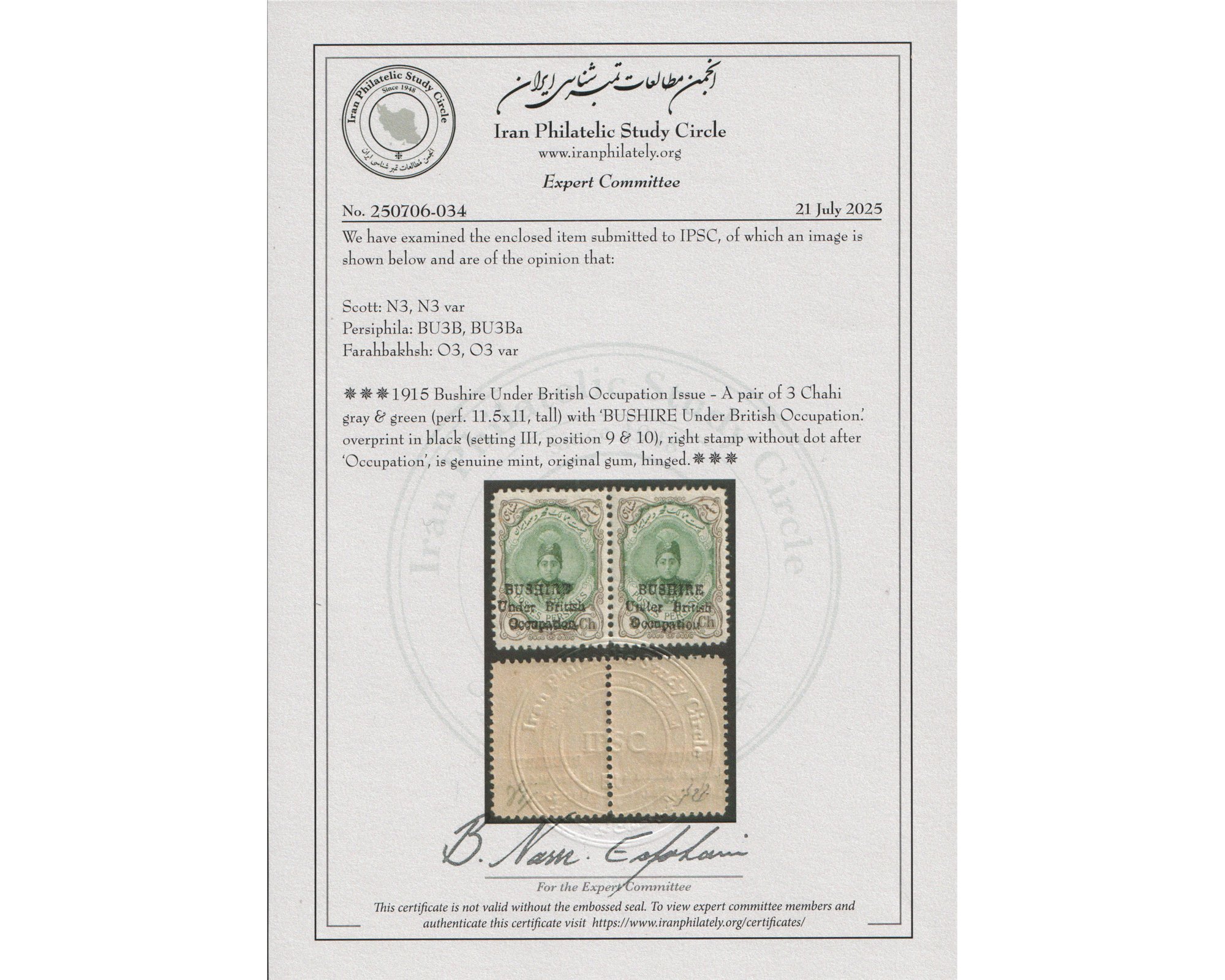 جفت سه شاهی بوشهر با واریته بدون نقطه Certificated by IPSCCondition; Mint Very Lightly Hingedبا چسب اورجینال و اثربسیار ضعیف شار نیهبرای دیدن با بهترین کیفیت ماوس کامپیوتر را روی تصویر تکان دهید