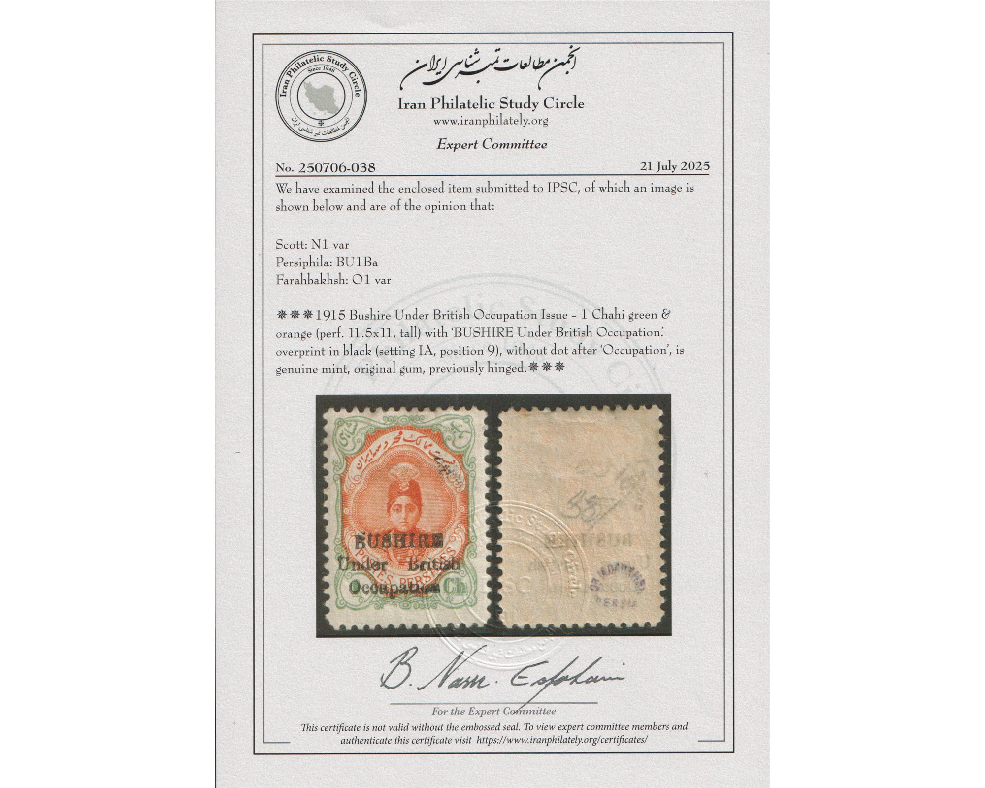 یک شاهی بوشهر با واریته بدون نقطه Certificated by IPSCCondition; Mint Lightly Hingedبا چسب اورجینال و اثر ضعیف شارنیهبرای دیدن با بهترین کیفیت ماوس کامپیوتر را روی تصویر تکان دهید