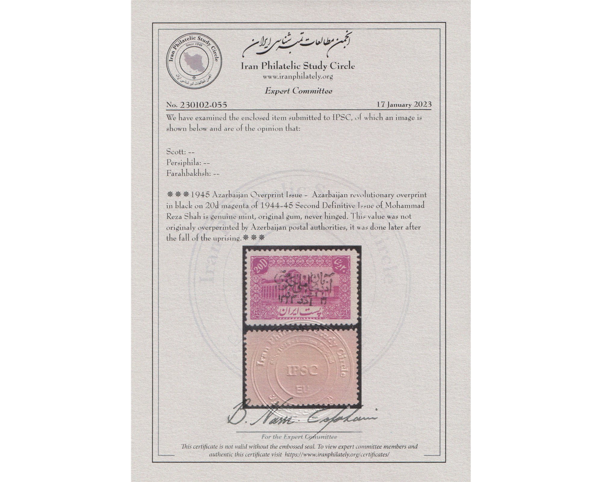 Unlisted 20 Dinar with Azerbaijan Overprint بیست دینار منتشر نشده با رو چاپ آذربایجان Certificate By IPSC Condition : Mint Never Hinged بدون اثر شارنیه