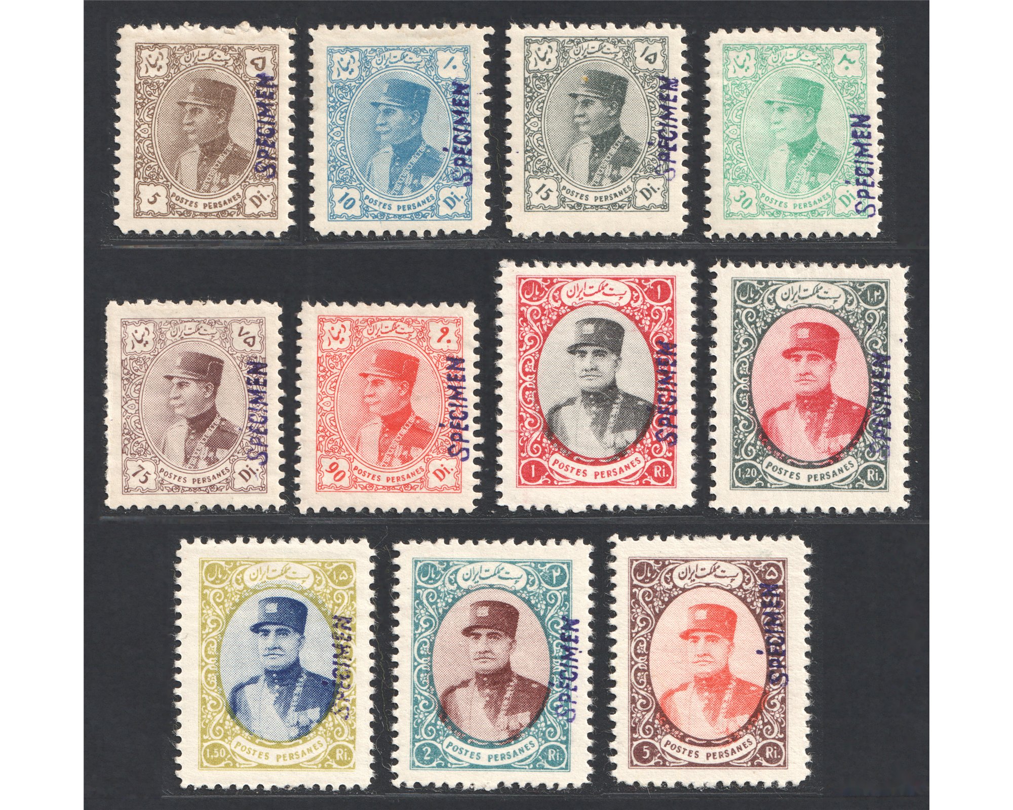 سری دیناری با رو چاپ نمونه 1935 Dinari Specimen Issue Condition; Mint Almost invisible trace of hinge Extremly Rare in this Condition با اثر بسیار ضعیف شارنیه