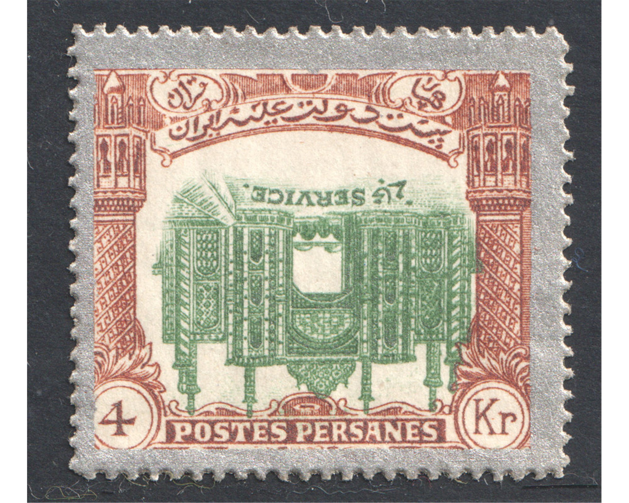 سال ۱۲۸۸ سری دیوانی نقره ای ۴ قران وسط وارو 1909 Divani Issue Silver Border 30 Kran Inverted Center Condition: Mint Very Lightly Hinged با اثر بسیار ضعیف شارنیه