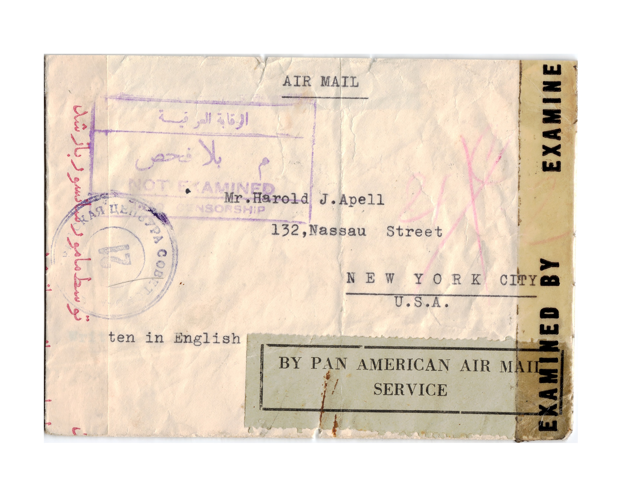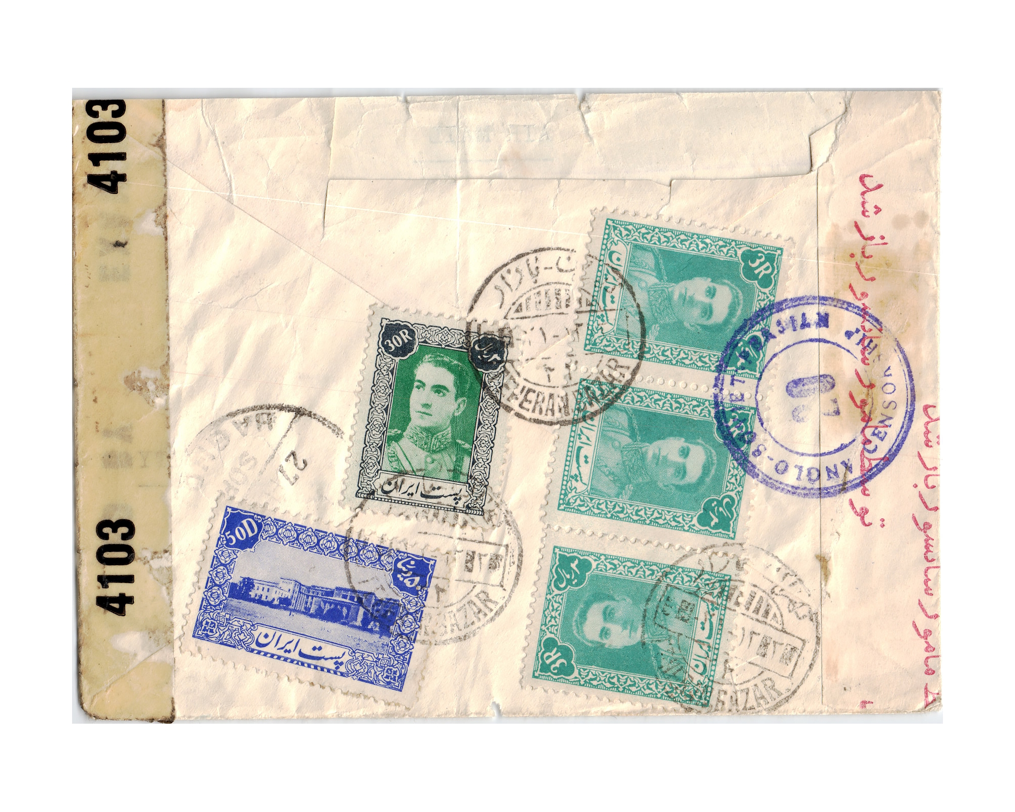 1944 Censored Airmail cover from Tehran to USA Franked with 30 Rial of 1st Definitive Issue Plus 3 copies of 3R and 50Di of 1st Defifnitive Issue With Angolo Soviet Persian Censorship Marking