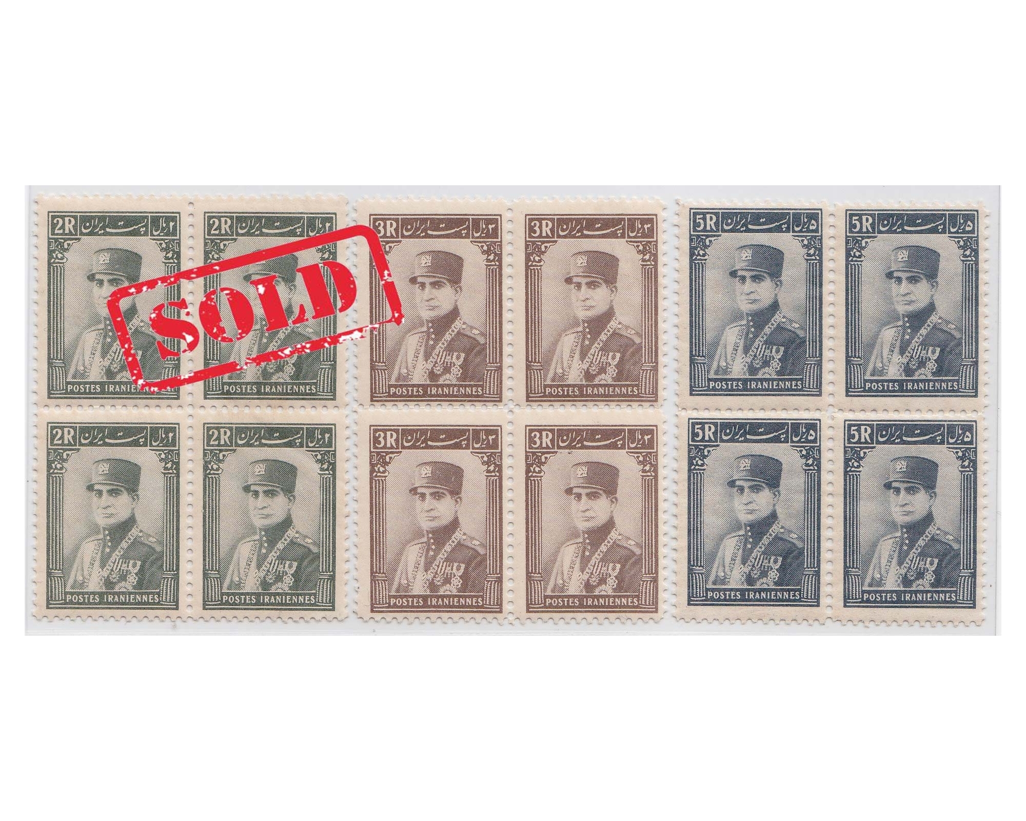سال۱۳۱۴بلوکه ۲ ریال و ۳ ریال و ۵ ریال سری کلاه ستونی بدون اثر شارنیهFarahbakhsh # 737-738-739