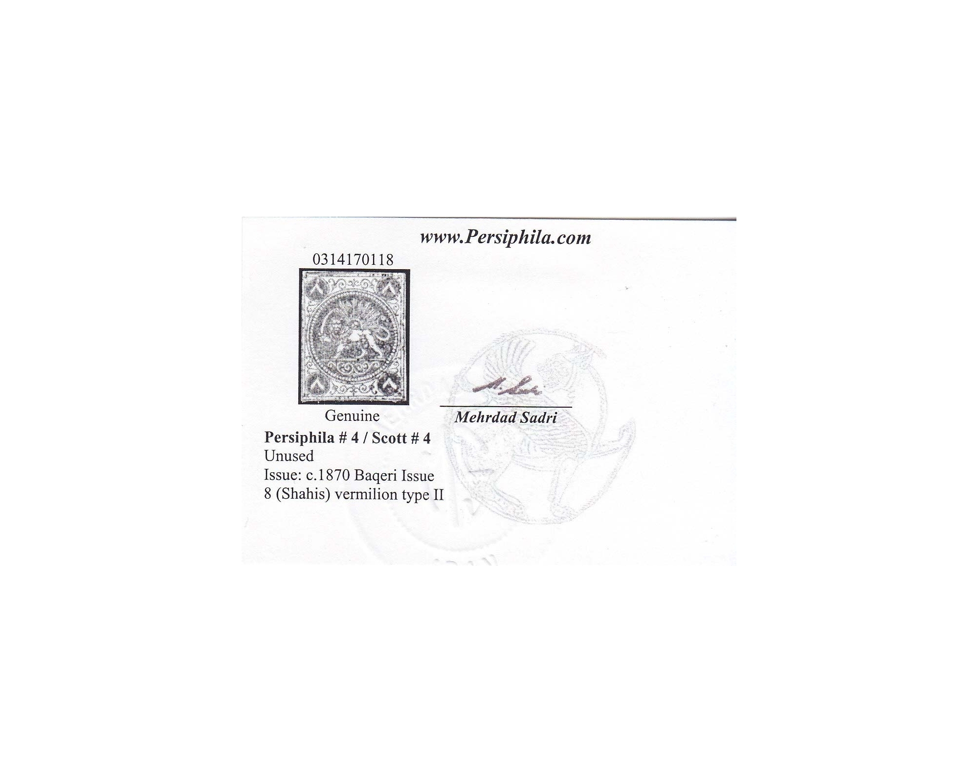 سال ۱۲۴۷ـ ۸ شاهی باقری قرمز با گواهی کارتی آقای صدری "Type II"کیفیت: بی باطل Farahbakhsh N° 4; Persiphila 4