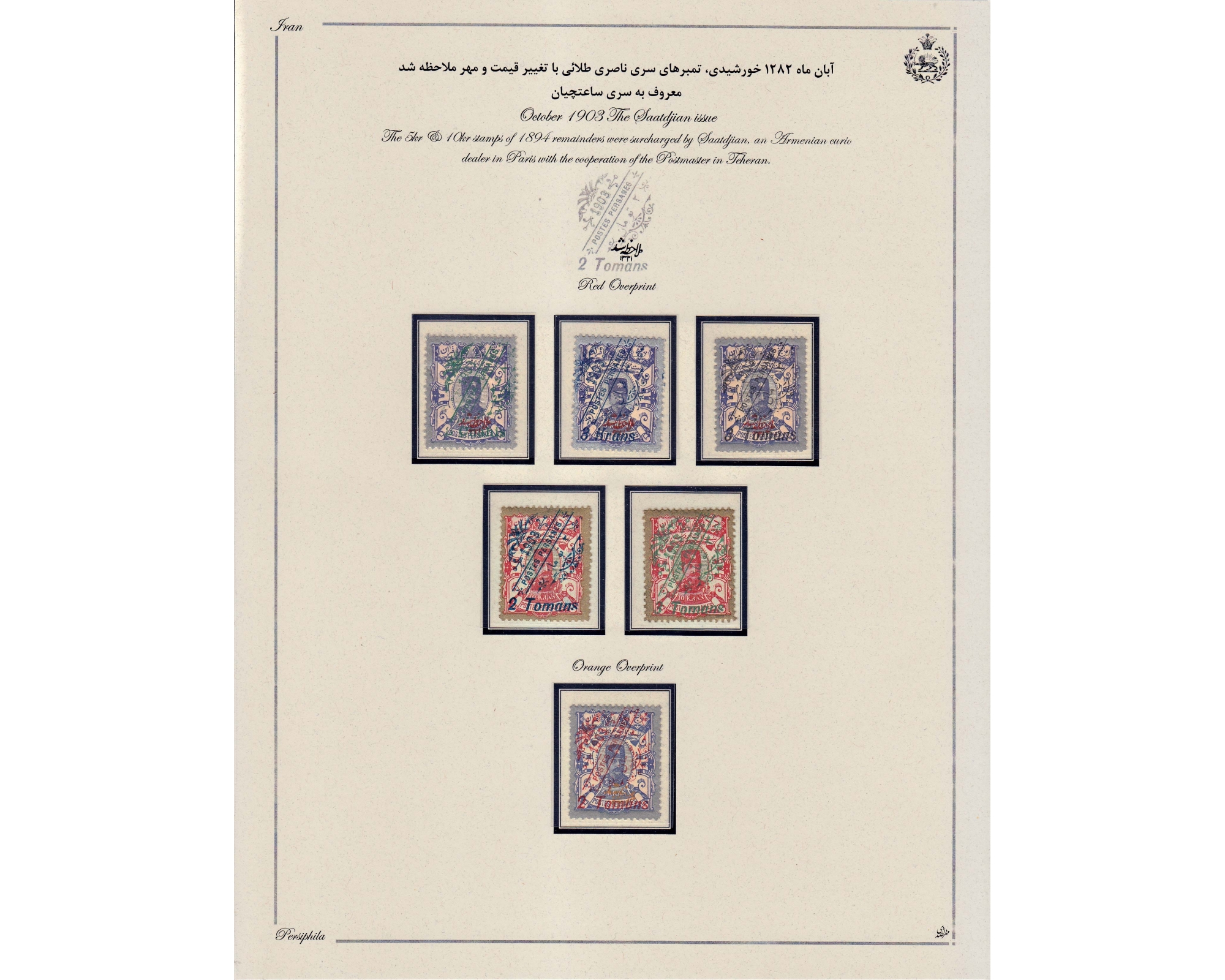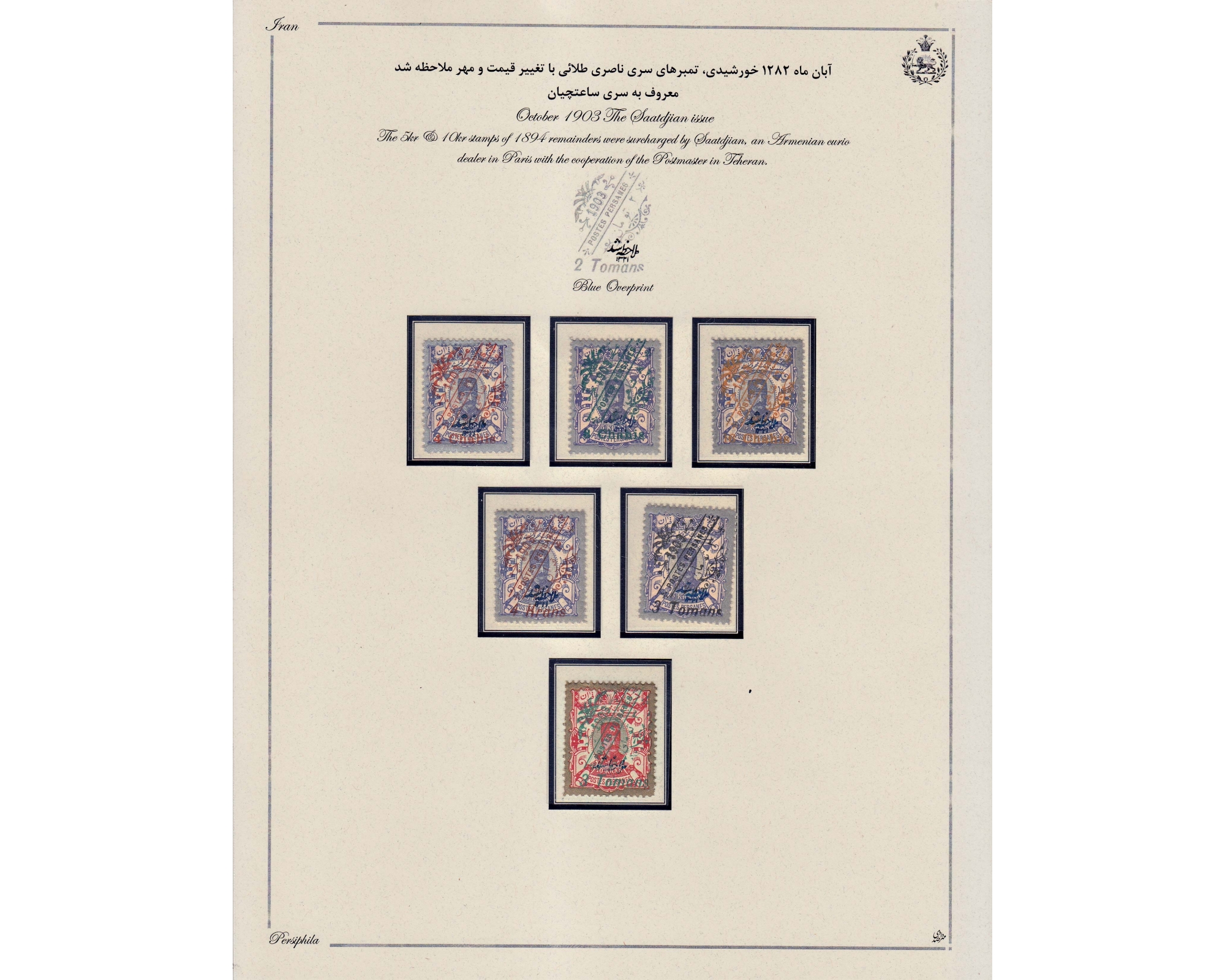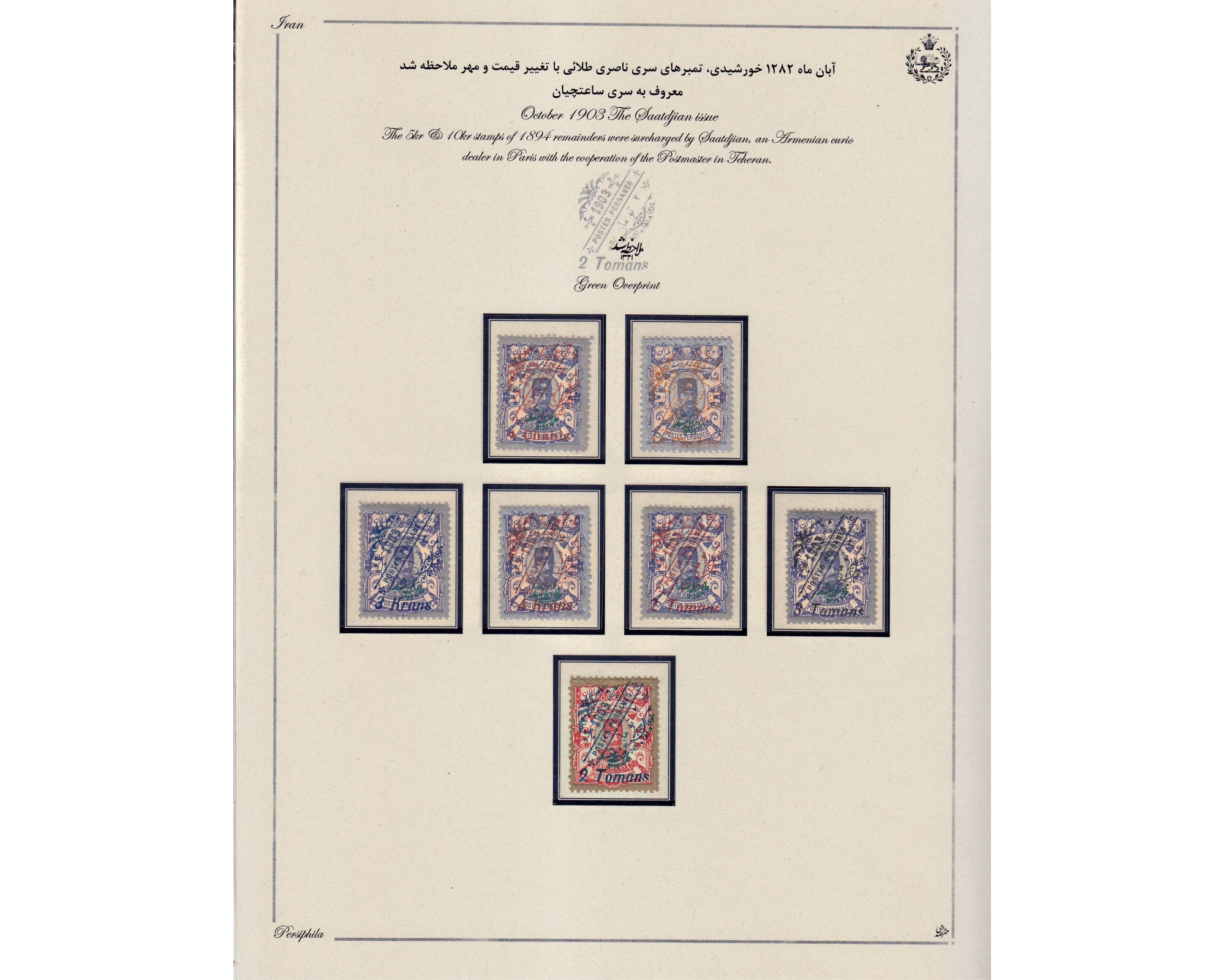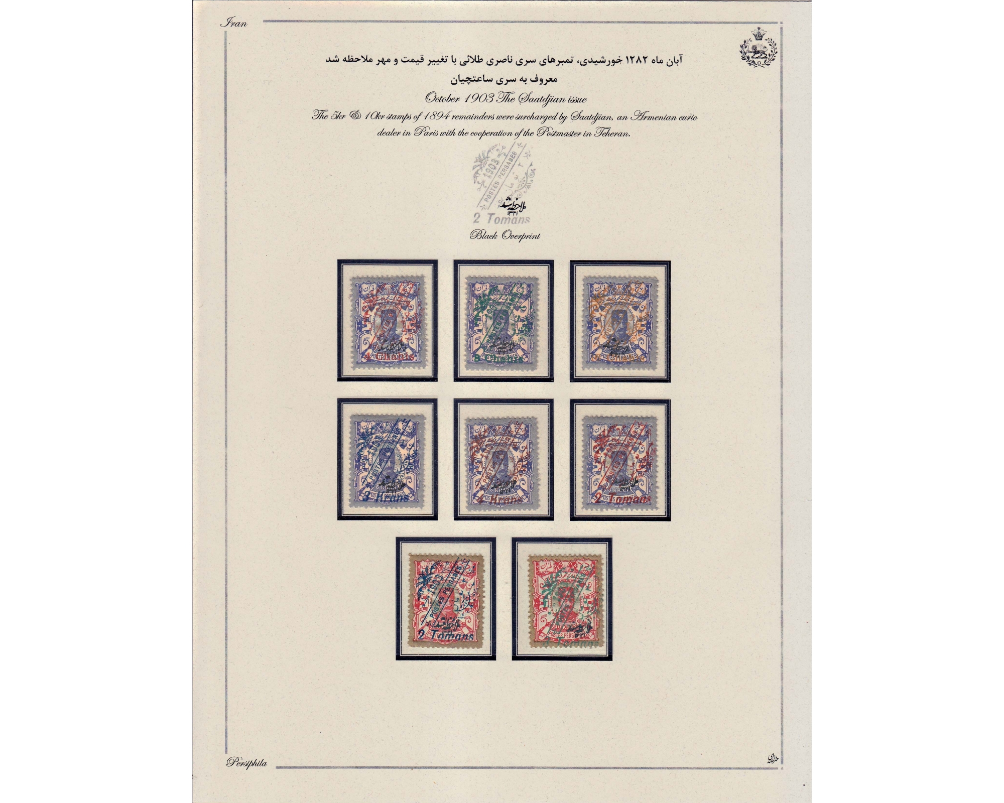 کلکسیون تمبرهای سری سا تچیان با تمام واریته های رنگیتماماً امضا شده ی آقای صدریتنظیم شده روی ورقه های پرسیفیلآ به وسیله آقای صدری